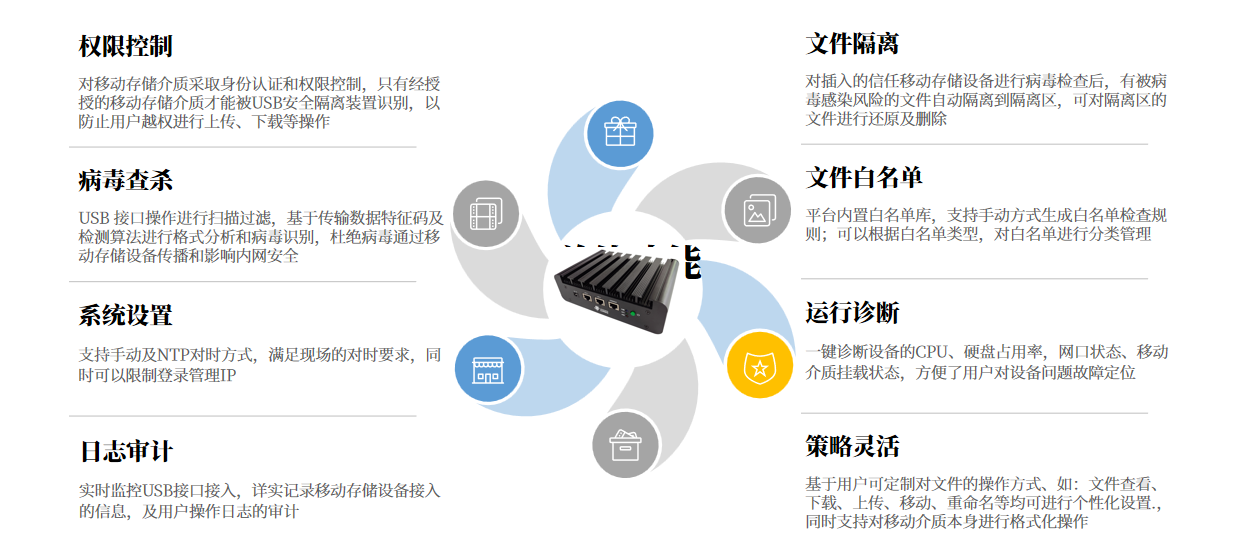 江民數據安全交換系統V2.0遵循國家工業安全相關要求,是專為實現USB設備接入安全防控而設計開發的軟硬件一體化產品。產品集“認證、授權、殺毒、審計”于一體,具備USB存儲介質接入認證、自定義人員操作權限、USB存儲介質接入殺毒掃描以及登錄與操作詳細審計等功能,實現了USB存儲安全事件“事前預防、事中管控、事后審計”全生命周期跟蹤。為電力、能源、政府、軍隊、軍工等不同行業提供了完整的USB介質安全管理方案。
